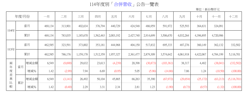 | 月份 | 當月合併金額 | 月份 | 當月合併金額 |