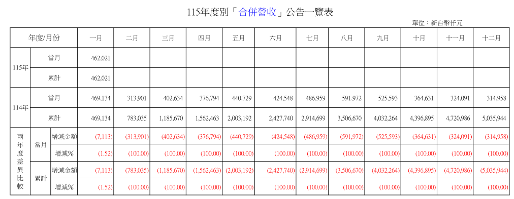 | 月份 | 當月合併金額 | 月份 | 當月合併金額 |